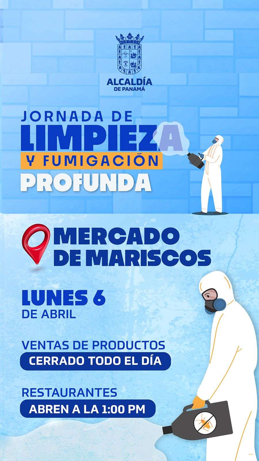 La Alcaldía de Panamá informa que el lunes 6 de abril los restaurantes del Mercado de Mariscos atenderán a partir de la 1:00 p.m., mientras que el área de ventas de productos cerrará todo este día por una jornada de limpieza profunda.