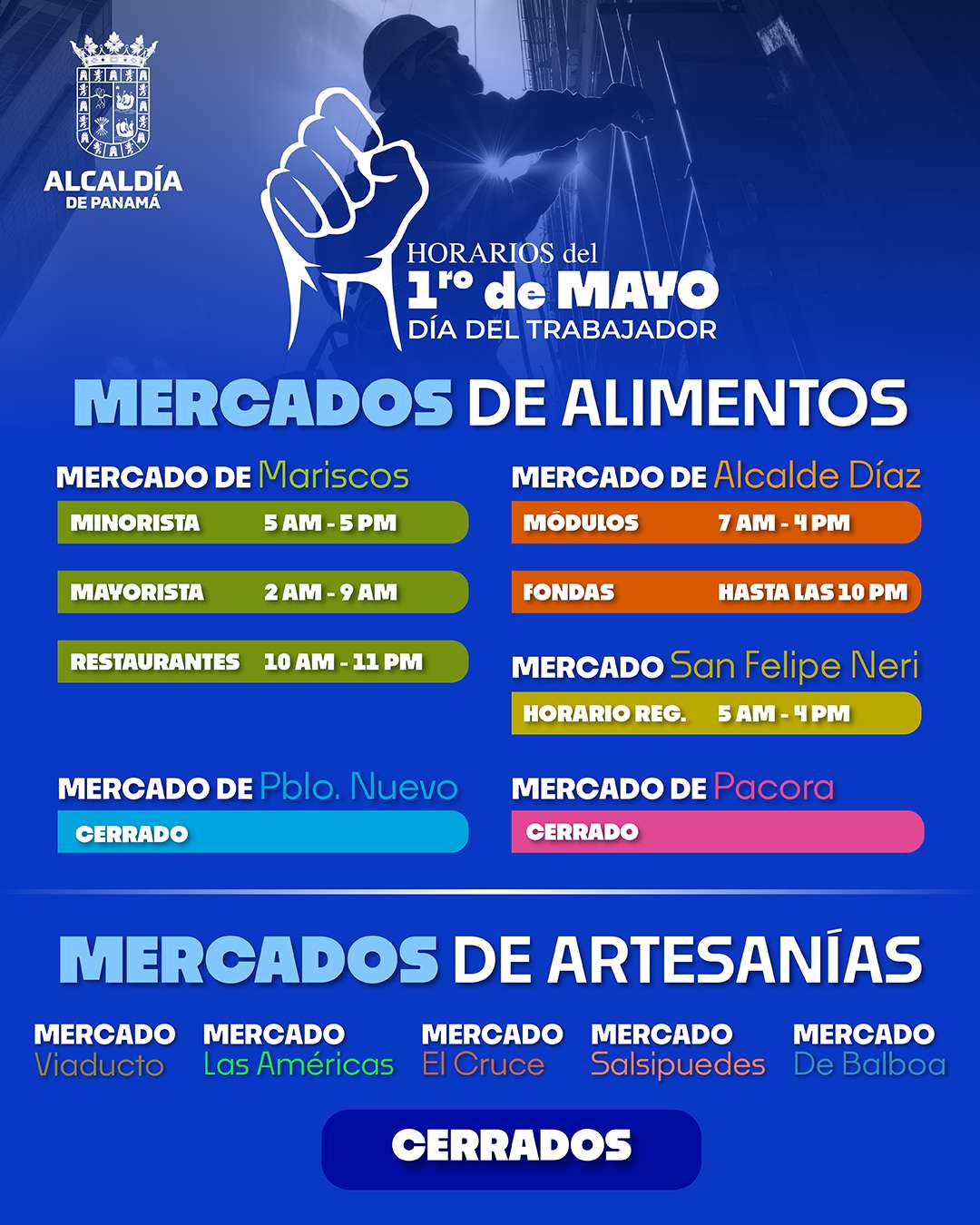 La Alcaldía de Panamá anuncia que el viernes 1° de mayo, ‘Día del Trabajador’, el Mercado de Mariscos, el Mercado San Felipe Neri, Los Pueblitos, el Jardín Botánico Summit y Sabores del Chorrillo abrirán al público.
