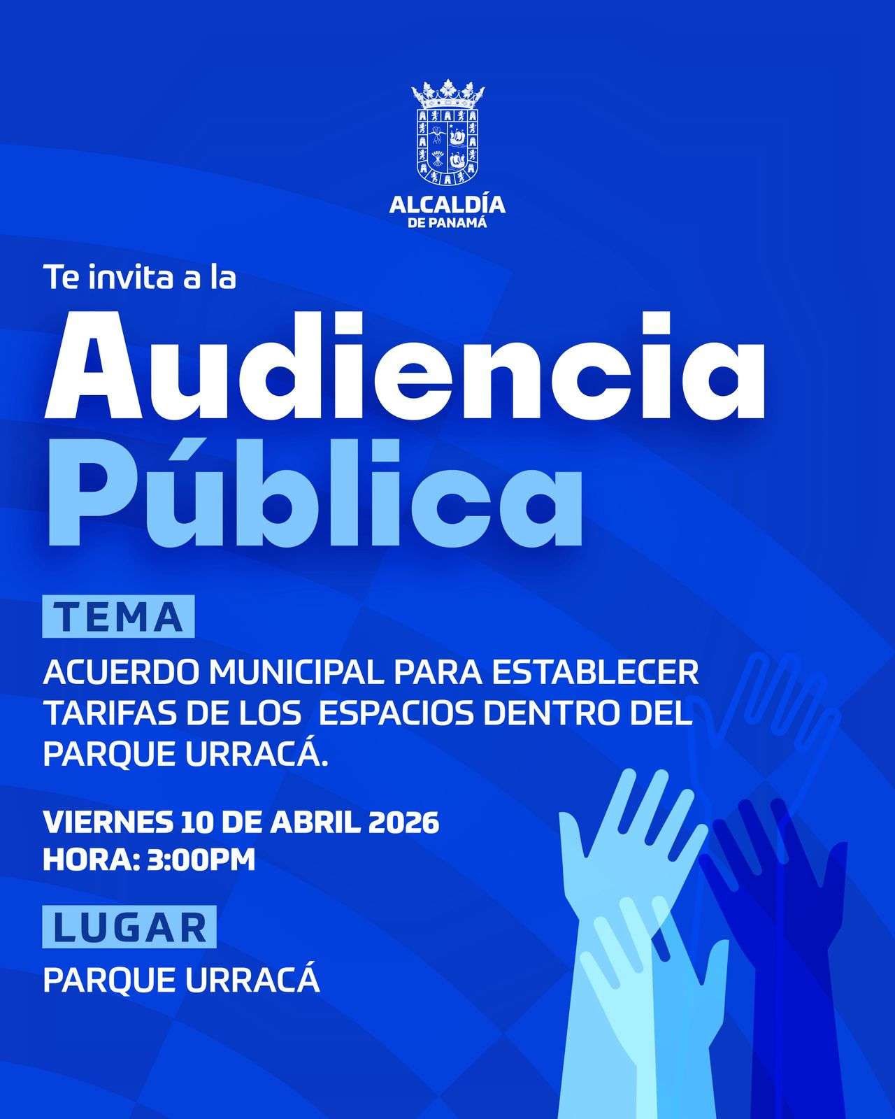 La Alcaldía de Panamá convoca a los ciudadanos a una Audiencia Pública este viernes 10 de abril a las 3:00 p.m., en las instalaciones del Parque Urracá para conocer el acuerdo que establece tarifas por el uso de instalaciones en este espacio público.