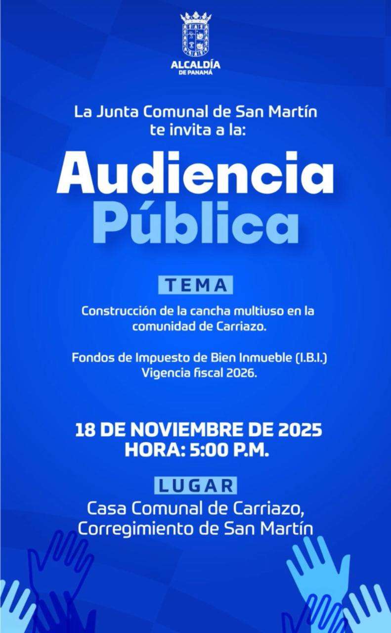 La Dirección de Participación Ciudadana de la Alcaldía de Panamá convoca a la Audiencia Pública que se realizará en la Casa Comunal de Carriazo, corregimiento de San Martín, este 18 de noviembre a las 5:00 p.m.