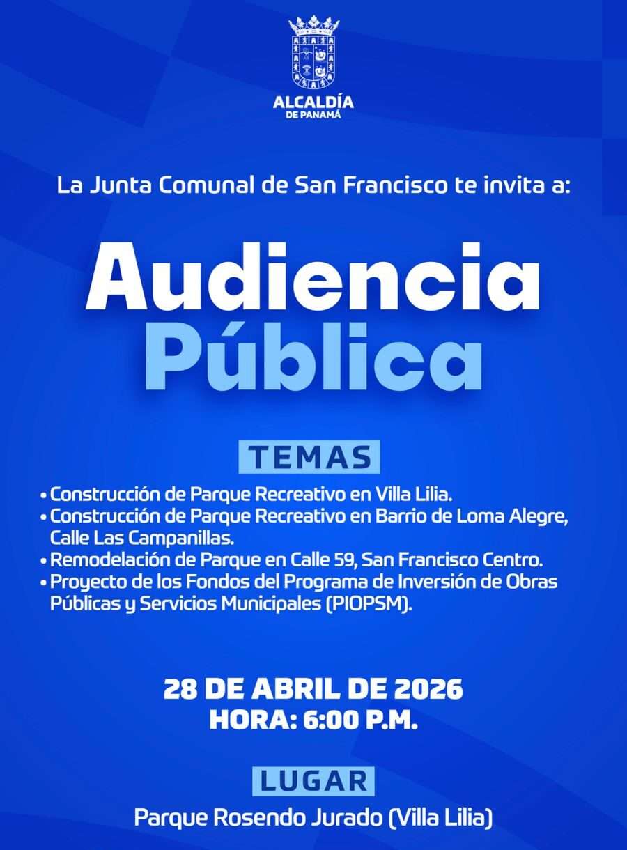 Foto archivo. La Alcaldía de Panamá convoca a los ciudadanos a participar de la Audiencia Pública que se realizará este martes 28 de abril a las 6:00 p.m., en el Parque Rosendo Jurado de Villa Lilla, corregimiento de San Francisco.