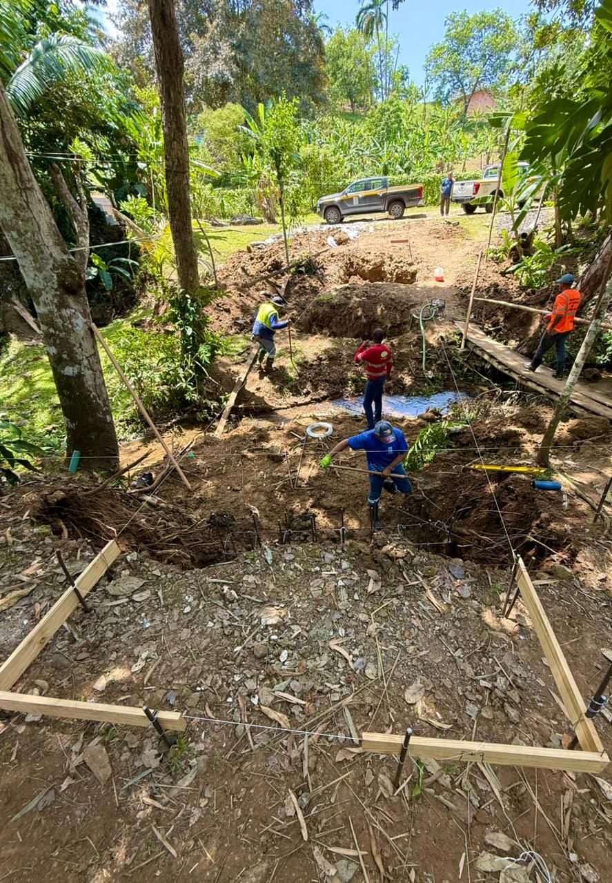 El equipo que avanza en el levantamiento de las bases del puente peatonal con el armado de encofrados para realizar posteriormente los vaciados de concreto y así eliminar el viejo paso de madera que pone en riesgo a los cientos de habitantes y estudiantes que a diario cruzan la quebrada para dirigirse a sus escuelas y trabajos.