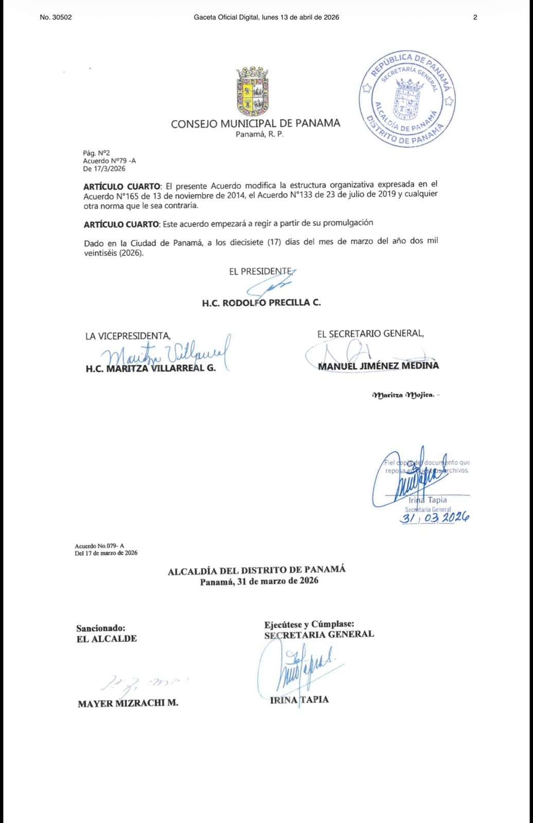 El acuerdo fue sancionado por el alcalde de Panamá, Mayer Mizrachi, y forma parte del proceso de modernización institucional impulsado por la actual administración, orientado a la digitalización de servicios, la simplificación de trámites y el fortalecimiento de la gobernanza municipal.