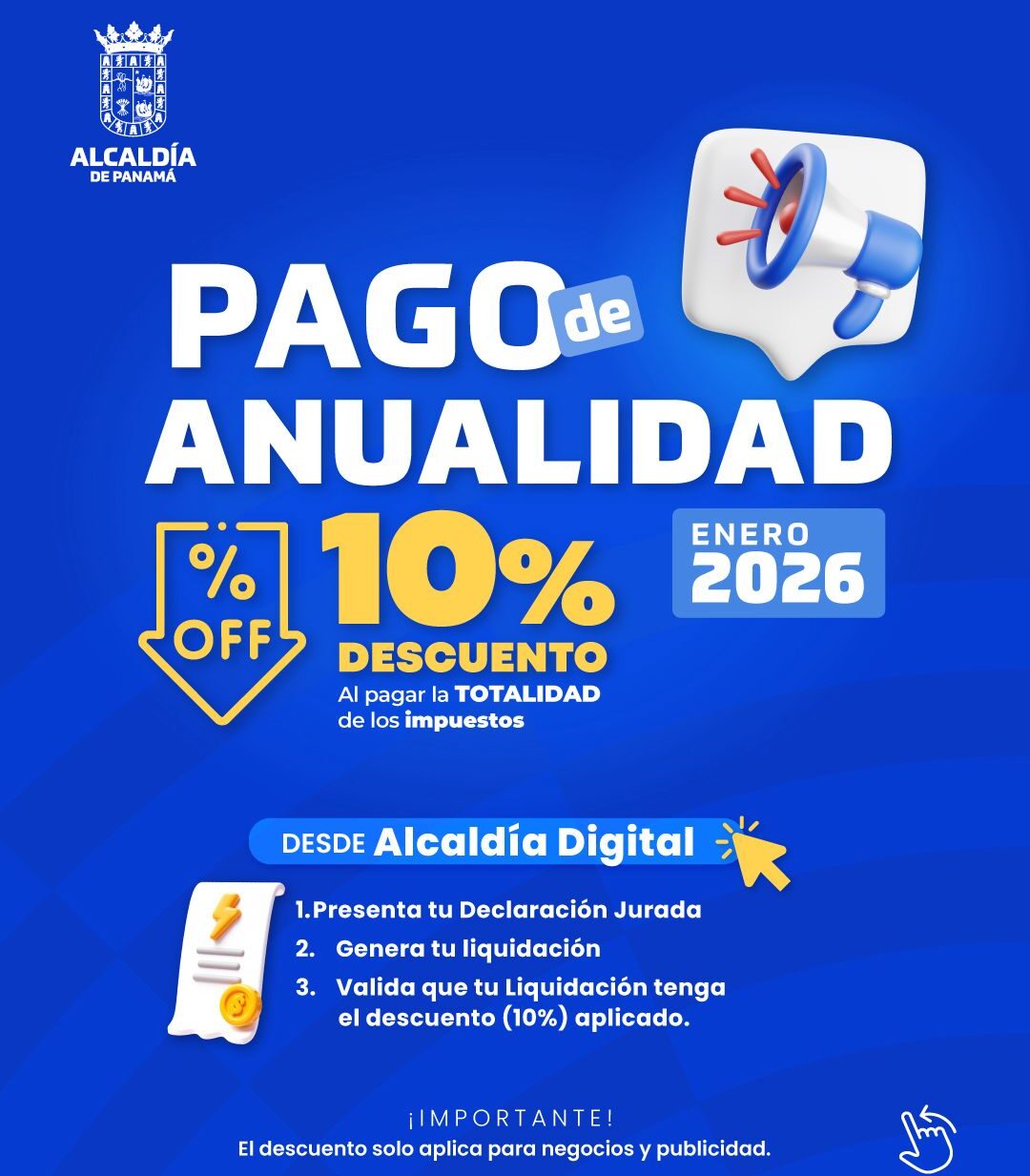 La Alcaldía de Panamá informa que los contribuyentes que realicen en enero de 2026 el pago del total de la anualidad de impuestos municipales podrán acceder a un descuento del 10%.