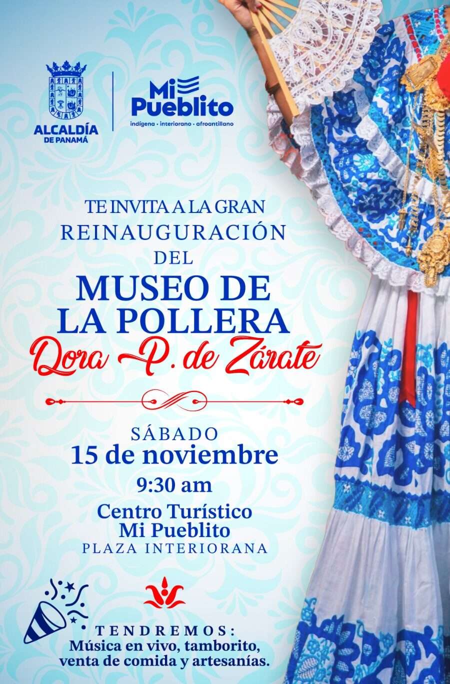 La Alcaldía de Panamá invita al público en general a la reinauguración del Museo de la Pollera ‘Dora Pérez de Zárate’ este sábado 15 de noviembre a las 9:30 a.m. en el Centro Turístico Mi Pueblito, Plaza Interiorana.