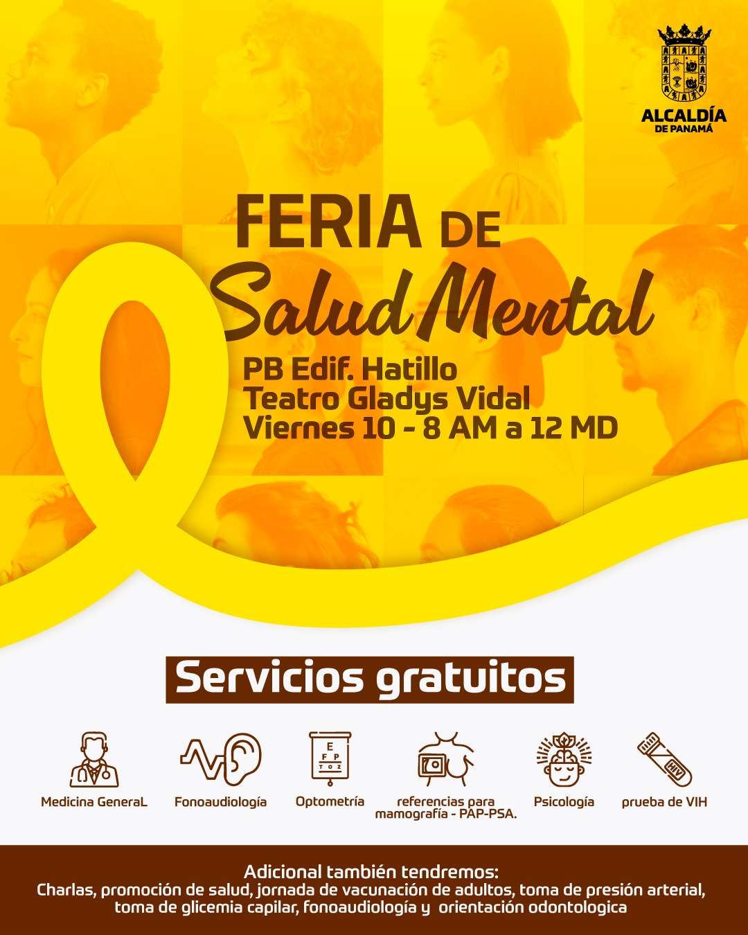 La Alcaldía de Panamá, a través de sus programas de bienestar y atención comunitaria, realizará este viernes 10 de octubre la Feria de Salud Mental, en la planta baja del Edificio Hatillo, específicamente en el Teatro Gladys Vidal, en horario de 8:00 a.m. a 12:00 m.d.