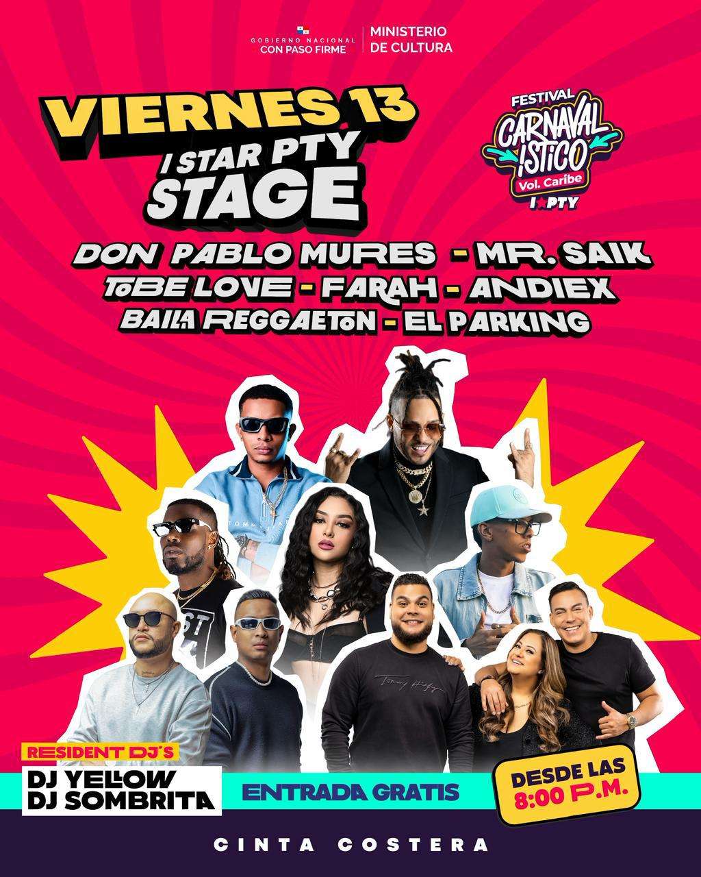 En el I Star PTY Stage, la energía urbana y tropical estará a cargo de Don Pablo Mures, Mr. Saik, Tobe Love, Farah, Andiex, Baila Reggaetón y El Parking, junto a DJ Yellow y DJ Sombrita, garantizando una noche continua de música y entretenimiento.